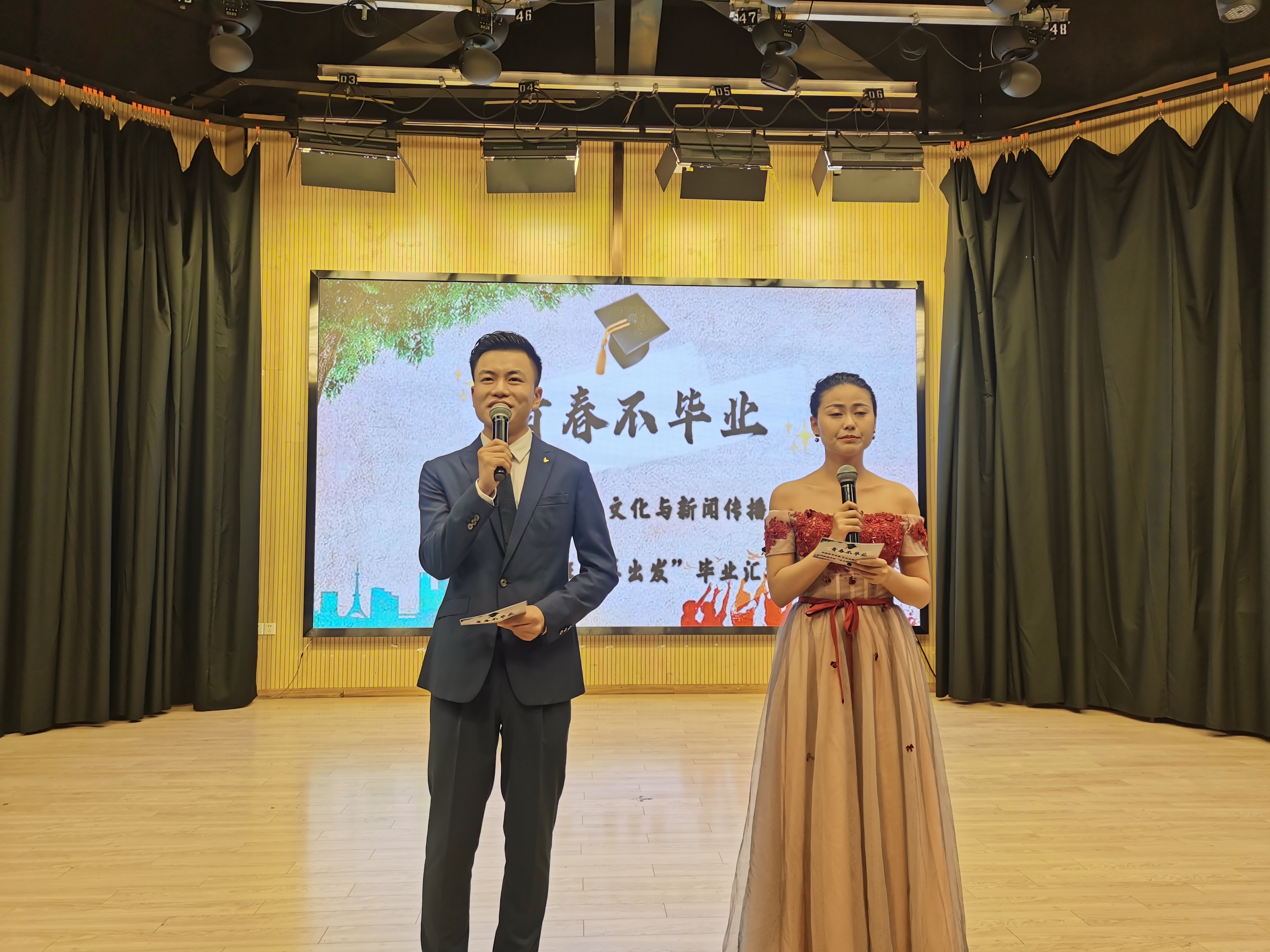 本网讯(通讯员:夏岩)近日,文化与新闻传播学院2017级播音与主持艺术专业“再出发”毕业汇报演出在新闻演播厅如期举行,文化与新闻传播学院副院长洪玉、新闻系副主任张倩、专业教师吴琼、郑帅、翟春翔等到场并观看了演出。