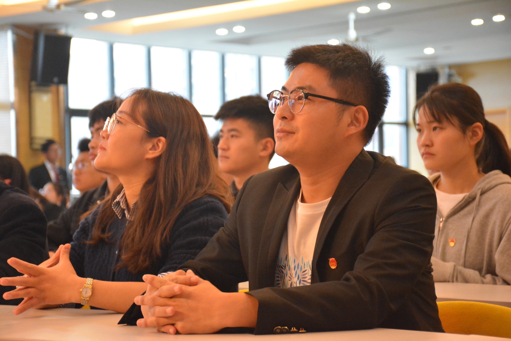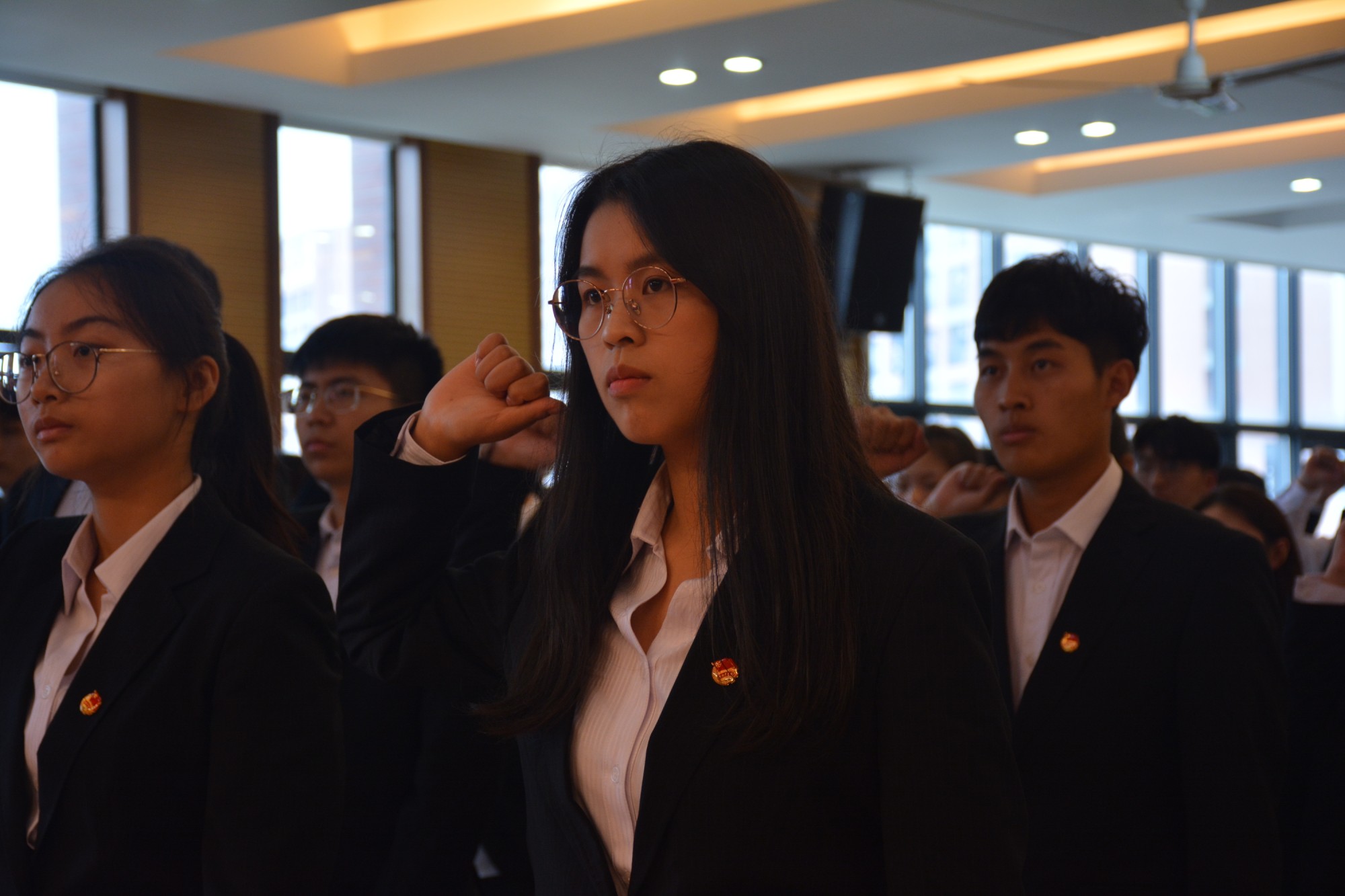 大会在庄严的团歌中拉开序幕。首先,王丹立与魏居娴宣读第十五届先进个人和优秀学生骨干的名单,并由周刘湘与彭智为其颁发荣誉证书,为新一届的团总支成员树立了典型,树立了榜样。随后,第十五届团总支学生副书记陈润洲做工作汇报,汇报了上一届工作中取得的成绩,总结了存在的不足,同时对新一届团总支充满希望。接着,魏高莉宣读新一届团总支学生骨干名单,并由俞士毛为学生骨干颁发聘书,合影留念。接着,第十六届团总支学生副书记吴佩玉对新学年的工作做出了工作规划,她表示将会沿袭上届团总支的优良传统,并在此基础上进行突破和创新,展望未来,迎接挑战,不忘初心,砥砺前行。国旗护卫队四名擎旗手手擎团旗,与新老两届团总支副书记进行了旗帜交接,团总支全体成员进行宣誓仪式,象征着责任与使命的传承。