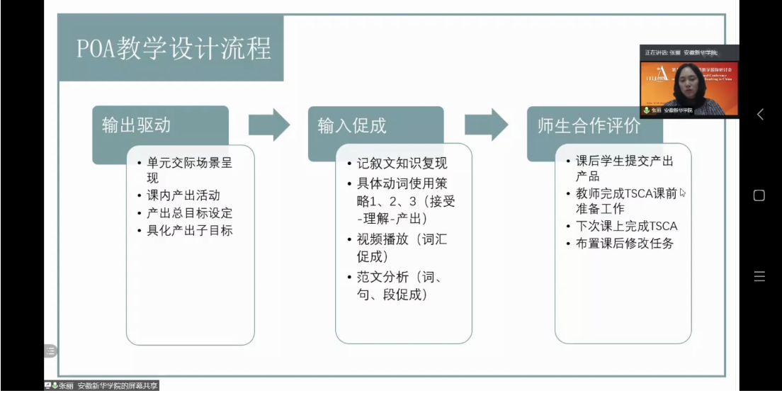 通过参加此次论坛并做汇报发言,张丽老师收获颇丰,更加明确了促成活动的设计要考虑课堂中的可操作性,宁愿少教一点、少一些促成活动,也一定要让学生所学落地生根。论坛聚力POA学习者进一步了解、理解POA,帮助一线教师更好地开展POA教学实践,提升教学质量,致力于解决中国大学生“学用分离”之弊端。
