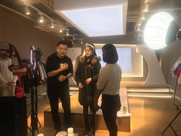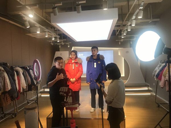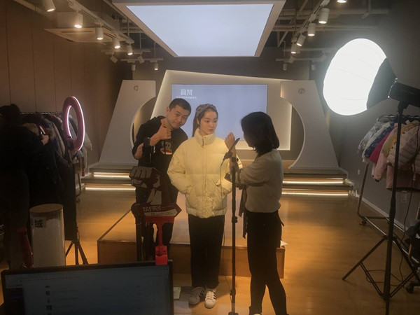 本网讯(通讯员:马银玥)为培养面向数字媒体时代的新媒体人才,永利官网与企业合作创设供给侧全新赛道为学生提供多元化的实践平台。近日,安徽电视台主持人王小川在高梵羽绒服总部开启直播,2018级播音班郑庆龙、冯玮莹和2019级表演班李竹、周振飞四位同学全程参与。直播当天,为了顺利完成直播,同学们提前到达场地,在指导老师的带领下深入了解直播产品,学习直播流程以及相关注意事项,并进行模拟直播练习。在直播过程中,同学们很快进入状态、融入其中,配合王小川完成产品介绍、展示及互动,直播间氛围轻松活跃。