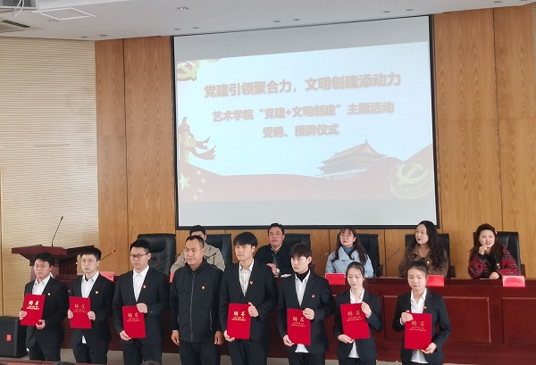 根据活动的日程推进,12月11日中午艺术学院在学术报告厅举行了“党建引领聚合力,文明创建添动力”——艺术学院“党建+文明创建”主题活动之党务助理团成立、党务工作人员受聘、党员及学生干部宿舍授牌仪式。艺术学院党总支书记许存福、艺术学院党总支副书记彭智、艺术学院党总支组织委员黄梦、艺术学院党总支组织员张大勇、艺术学院第一学生党支部书记张小菊、艺术学院第二学生党支部书记高扬出席本次大会,大会由张大勇主持,艺术学院全体学生党员、入党积极分子、学生干部参加了会议。