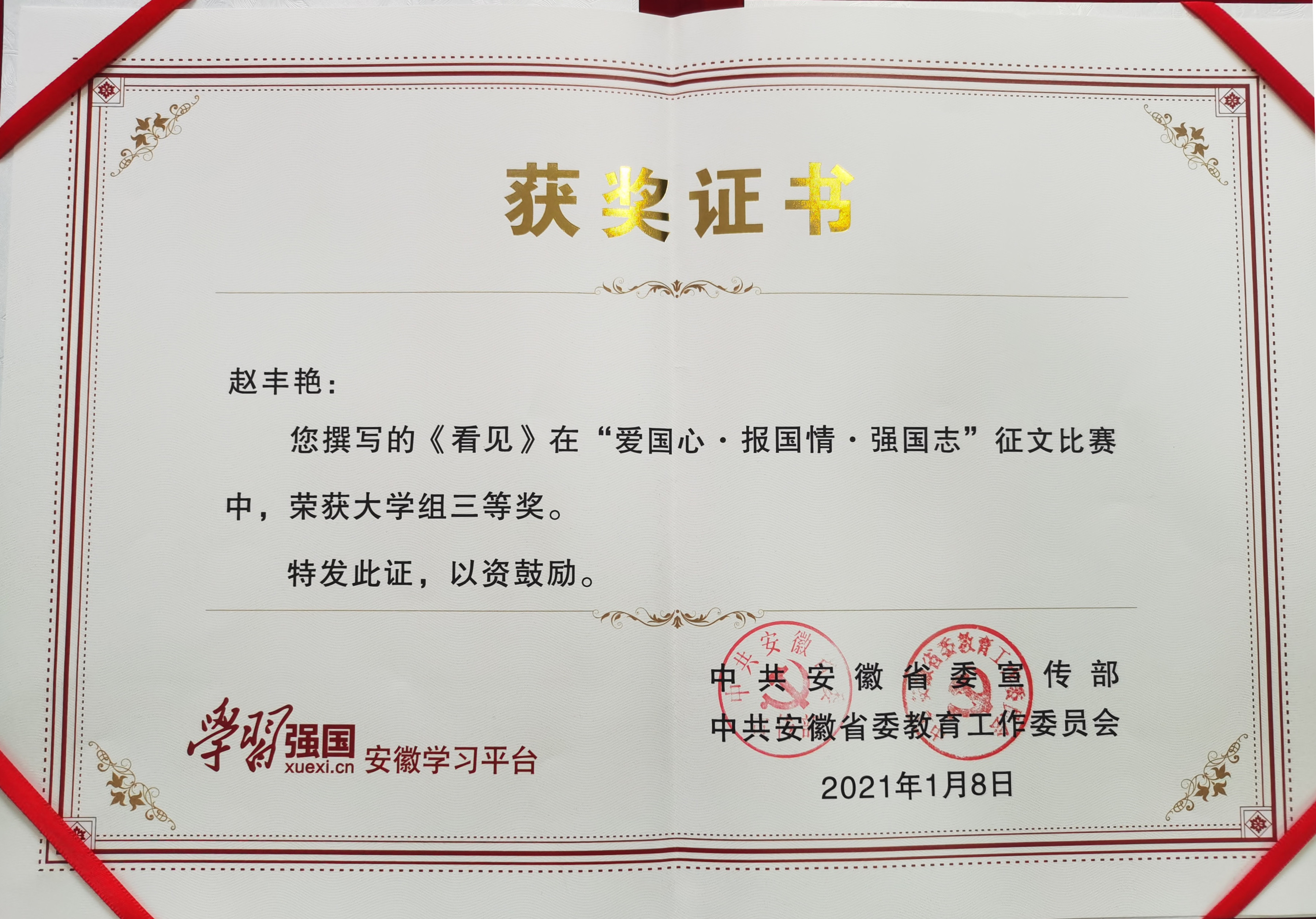 本网讯(通讯员:刘丽娟)近日,“学习强国”安徽学习平台“爱国心·报国情·强国志”征文活动获奖名单出炉,永利官网2020级赵丰艳同学的作品《看见》荣获大学组三等奖,马克思主义学院邵萍英老师荣获“优秀指导教师”称号。