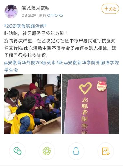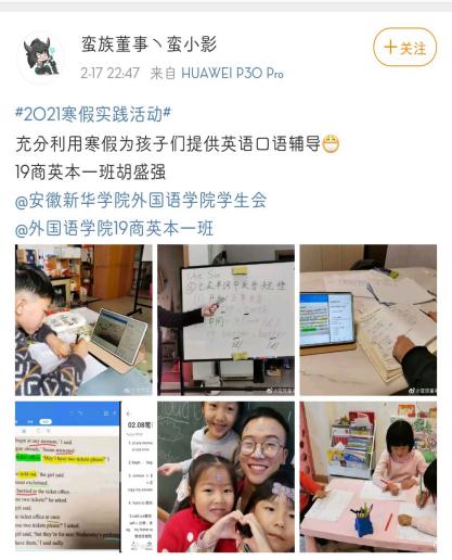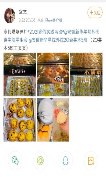 外国语学院秉持以思想教育为先导、以养成教育为核心的工作理念,不断创新活动开展方式。本次活动包括志愿服务、清扫卫生、小试厨艺等多种形式,活动成果由各团支部通过注册微博账号,引导支部成员以照片和视频的形式在微博进行打卡分享。在疫情防控之际,20级英本3班黄欣悦同学积极参与社区志愿服务,为居民宣传抗疫知识,在劳动中不断学习,不断成长。19级商英本1班胡盛强同学利用寒假为孩子们提供英语口语辅导,不仅充分发挥了专业优势,也增强了自己的社会服务意识。20级英本5班王文文同学利用闲暇时间通过学习烘培,为家人带来了一场特别的美食体验,不少学生也纷纷在家挽起袖子,走进厨房。