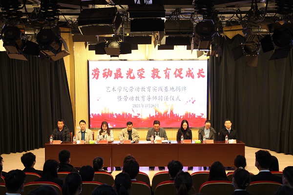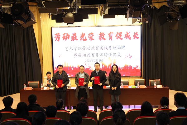 3月26日,艺术学院在文传演播厅举办劳动教育实践基地揭牌暨劳动教育导师聘任仪式。校劳动教育研究中心主任朱平、校学生处处长助理计羚、艺术学院劳动教育导师、艺术学院领导班子及全体学工人员和学生代表参加了本次仪式,仪式由艺术学院院长助理彭智主持。