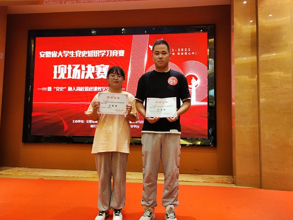 本网讯(通讯员:张爱丹)6月28日,由安徽省高校网络思政工作中心、安徽大学马克思主义学院主办的全省大学生党史知识学习竞赛决赛在合肥丰大国际大酒店举行,全省27所高校60位大学生参加现场决赛。永利官网杨辰曦、冉海枫两位同学在全省63071位大学生中脱颖而出,代表学校参加现场决赛。