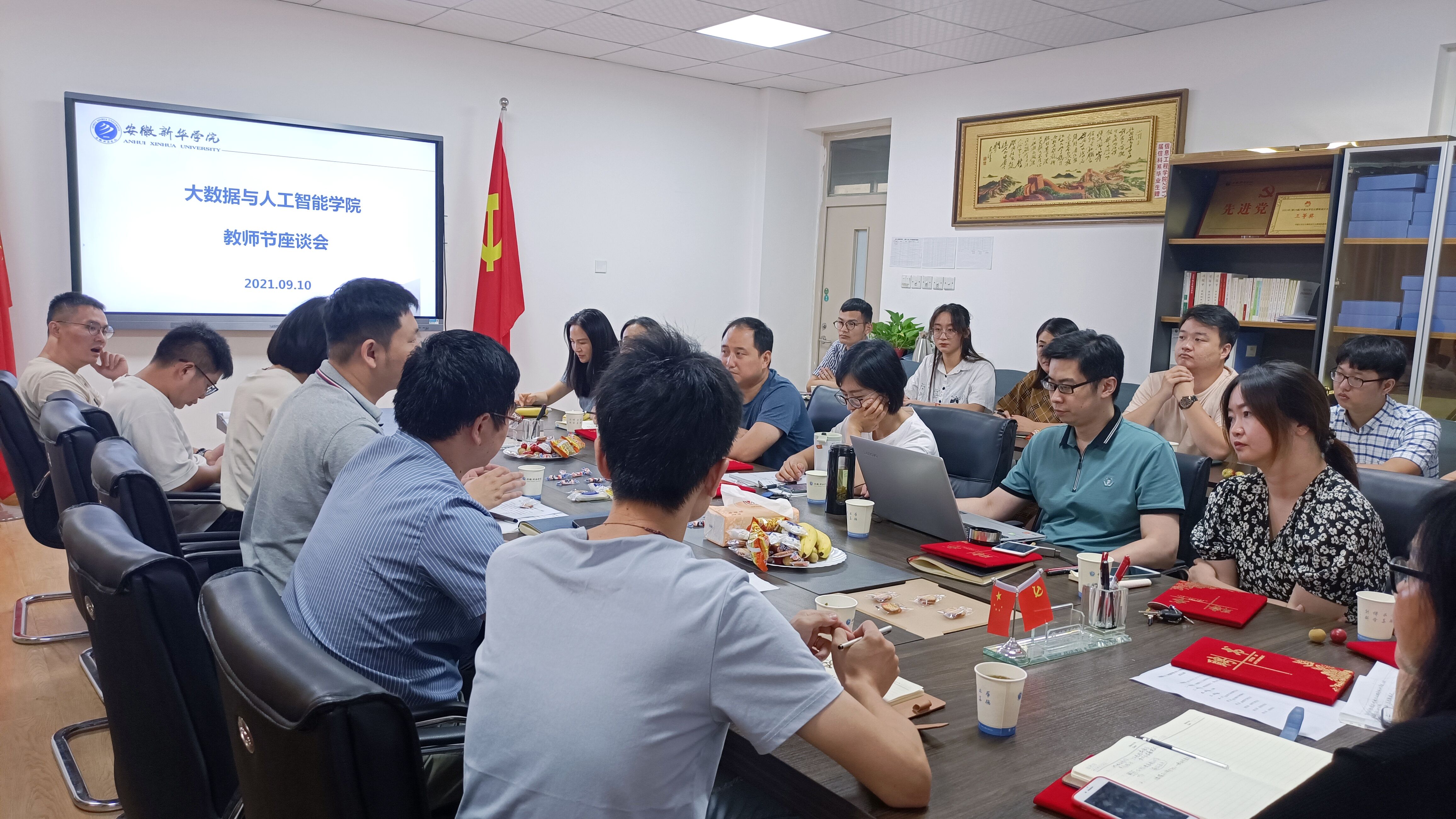 上午10时,大数据与人工智能学院在205会议室召开2021年教师节座谈会与导师聘任仪式。执行院长吕翔、副院长万家华、院长助理魏高莉、院长助理刘磊、学管秘书周刘湘、行政秘书张韬以及学院青年导师和新入职教师参加此次会议。首先,刘磊代表学院宣读青年导师聘任文件,万家华和魏高莉分别为青年导师颁发聘书。辅导员陈剑作为新教师代表发言,他表示自己将立足自身岗位,牢记使命担当,潜心立德树人,奉献教育事业。随后,青年导师和参会教师纷纷发言,分享了自己的在职经历及教师生涯,并希望大家坚定师者信念,以实际行动为学院发展作出贡献!
