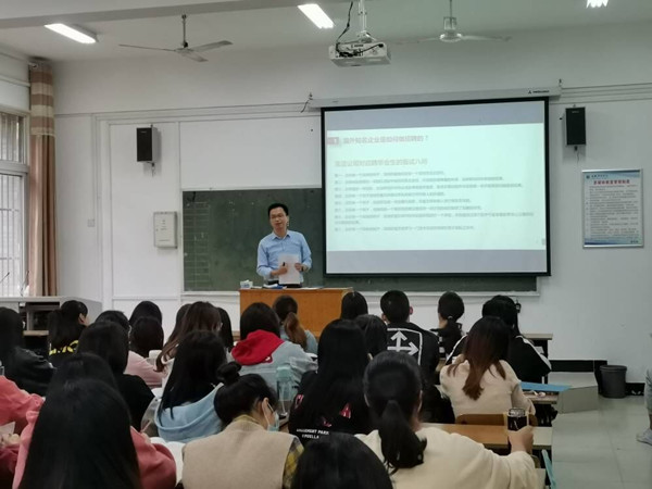 本网讯(通讯员:郭玉莉)10月11日,为进一步落实经管综合实训项目,提升学生的实践技能和综合能力,促进双师同台,进一步推进企业导师进课堂活动,商学院特邀新华集团行政人事部部长助理周景为2018级人力资源管理专业学生开展“企业招聘实战经验分享”主题讲座。此次活动也是商学院党总支“我为师生办实事”系列活动之一。活动分两个阶段,第一阶段周景老师做主题报告,第二阶段现场互动提问。