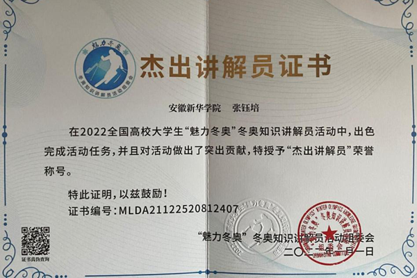 2022年2月将在中国北京举办冬季奥林匹克运动会,筹办北京冬奥会是我国重要历史节点的重大标志性活动,是展现国家形象、促进国家发展、振奋民族精神的重要契机,而2022全国高校大学生“魅力冬奥〞冬奥知识讲解员活动秉着弘扬冬奥精神,传播冬奥知识的目的举办,yl7703永利官网药学院21级药学一班张钰培同学通过互联网参加了全国高校大学生“魅力冬奥”冬奥知识讲解员活动,她通过互联网方式进行冬奥会知识讲解传播,并积极弘扬冬奥精神,传播冬奥知识,为冬奥会助力,由此获得了活动组委会颁发的“杰出讲解员”荣誉证书。