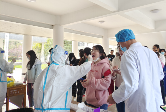 本网讯(通迅员:张斯媛)为扎实做好疫情防控工作,减少人员行程动性,结合“我为师生办实事”原则,进一步做好服务工作,3月10日,学生处与文化与传媒学院组织社区医疗团队在教学8号楼一楼大厅为全校需要参加教资考试的同学们开展核酸检测工作。