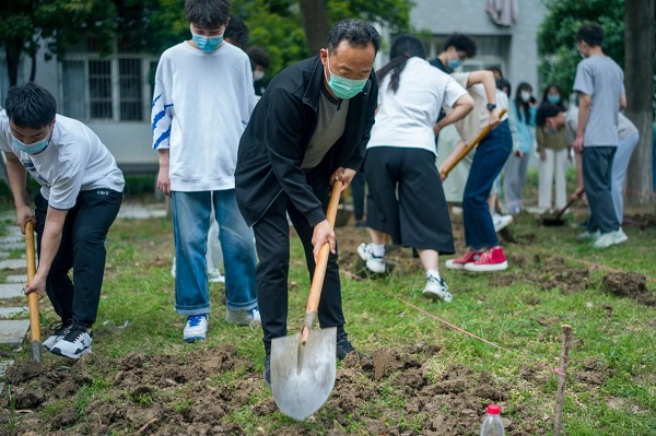 劳动教育活动开始,首先由朱平教授为同学们示范如何松土,同学们认真学习,随后便开始了自行劳作。大家进行分工,彼此合作,男生负责拿着铁锹进行松土,女生负责捡起土壤中的杂物。大家干劲十足,将种子有序地播撒在土壤中,为它们灌溉生命之水。同学们对于本次的劳动教育活动热情高涨,活动过程中无一不露出幸福的笑容。