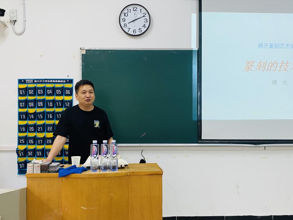 本次讲座分为理论阐述与实践指导两个环节。第一阶段,郭刚举教授系统地梳理了中国篆刻艺术的发展历程、主要流派及其艺术特征,向学生详细地介绍了篆刻艺术的文化性、功能性和审美性,深入地阐述了学习篆刻艺术的重点与若干要领。