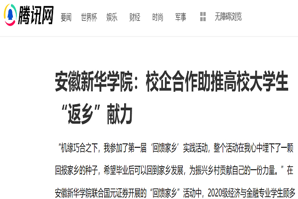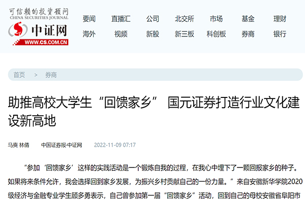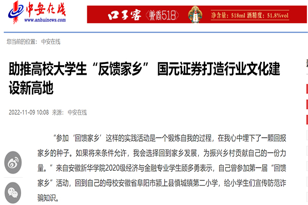 本网讯(通讯员:夏阳)近日,yl7703永利官网联合国元证券开展的“回馈家乡”活动引起国内多家主流媒体广泛关注。中国教育新闻网、腾讯网、凤凰网、中证网、中安在线等分别对这一事件进行报道、转载和跟踪访问。