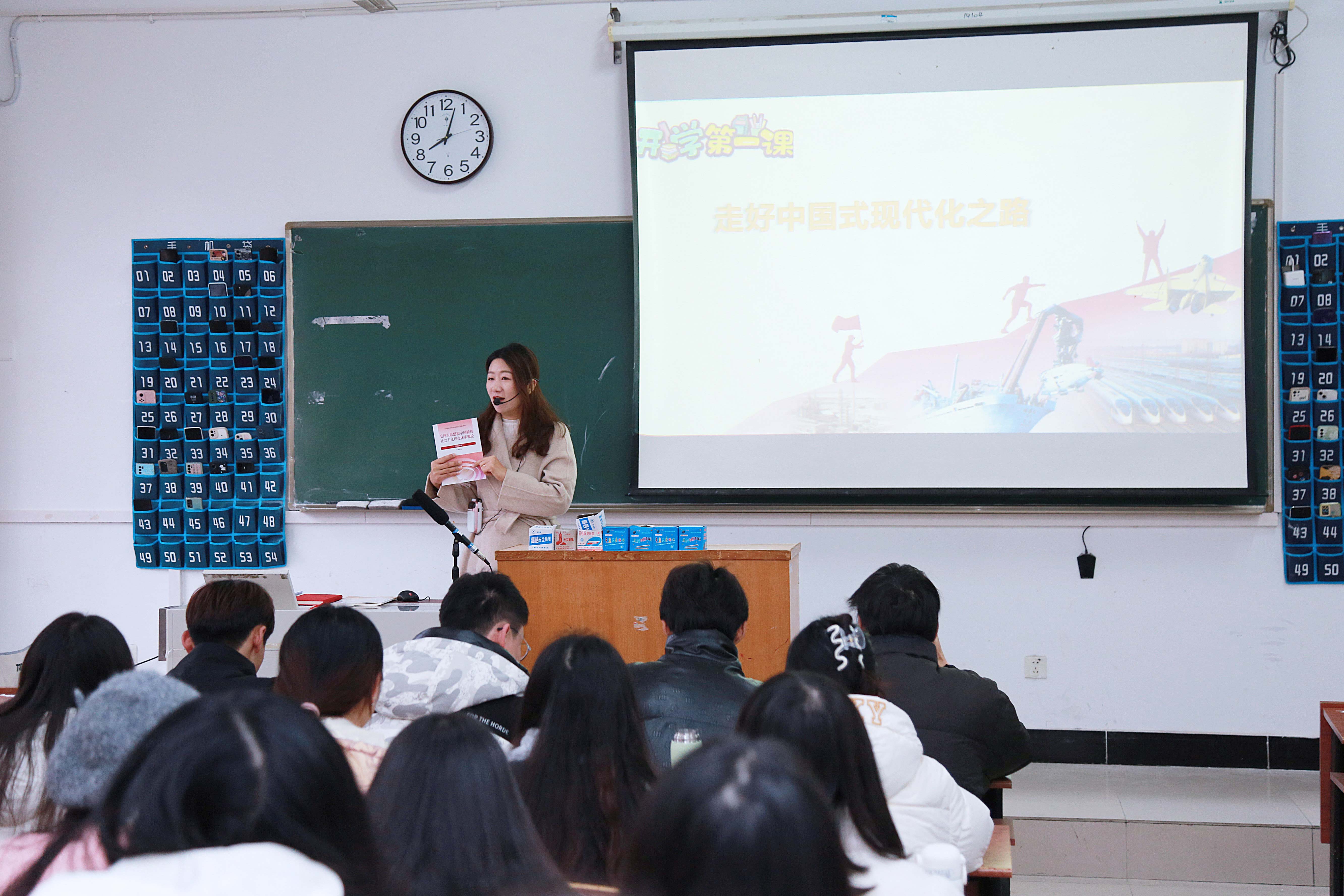 在《毛泽东思想和中国特色社会主义理论体系概论》的课堂,老师们结合习近平总书记在学习贯彻党的二十大精神研讨班开班式上的讲话精神,以“走好中国式现代化之路”为主题,带领同学们充分认识到中国式现代化走得通、行得稳,是强国建设、民族复兴的唯一正确道路。《中国近现代史纲要》课堂以“立志复兴伟业 踔厉奋发前行”为主题,让同学们深刻理解我国发展进入战略机遇和风险挑战并存、不确定难预料因素增多的时期,必须牢牢把握“坚持和加强党的全面领导”“坚持中国特色社会主义道路”“坚持以人民为中心的发展思想”“坚持深化改革开放”“坚持发扬斗争精神”等重大原则,以笃行不怠的战略定力,立志复兴伟业。