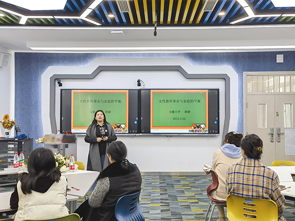 本网讯(通讯员:王肖,张丽)为进一步关爱女性教师健康成长,引领女教师贡献巾帼之智,更好地帮助教师成长与提升,2023年3月22日下午,外国语学院/国际教育学院在教(10)101智慧教室组织开展了教师专业素养提升工程第八期,本次活动特邀安徽大学国际教育学院院长胡健教授进行主题为“女性教师如何更好平衡工作与家庭”专题讲座。院长助理李怡嘉、教师发展中心主任张丽以及学院约30余名女教师参加了活动,讲座由李怡嘉主持。