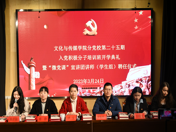 本网讯(通讯员:董文文 汪若雨)为深入学习宣传贯彻党的二十大精神,3月24日,文化与传媒学院分党校在演播厅举行第二十五期入党积极分子培训班开学典礼暨“微党课”宣讲团讲师(学生组)聘任仪式。学院党总支副书记(主持工作)洪玉、副书记罗振林、组织员王倩文、学生第二党支部支部书记褚静、学生第三党支部支部书记杨紫君以及党校全体学员参加典礼,典礼采取主会场+分会场的形式举行,由本期党校班主任韩世颖主持。
