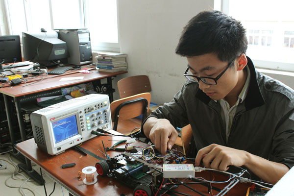 永利官网从2009年开始每年都会从电子通信工程学院选出学生参加全国大学生“飞思卡尔”杯智能汽车大赛的选拔,去年永利官网的两个小组分别拿到了安徽赛区的一等奖,但因为前四名才可以进入国赛,而永利官网一支参赛队伍是第五名,与全国大赛失之交臂,今年的他们又重新起航,以进入全国大赛为目标,项目组的负责人李俊翰坦言压力很大。指导老师纪利琴说:“今年我们的目标就是冲刺全国大赛,虽然他们现在在遇到问题的时候处理方法还是不够灵活,效率也不很高,但是他们足够努力认真,后期我们老师也会更多的参与进去,我相信我们能做的更好。我还希望他们每个团队都能更加团结,一起取得更好的成绩。”