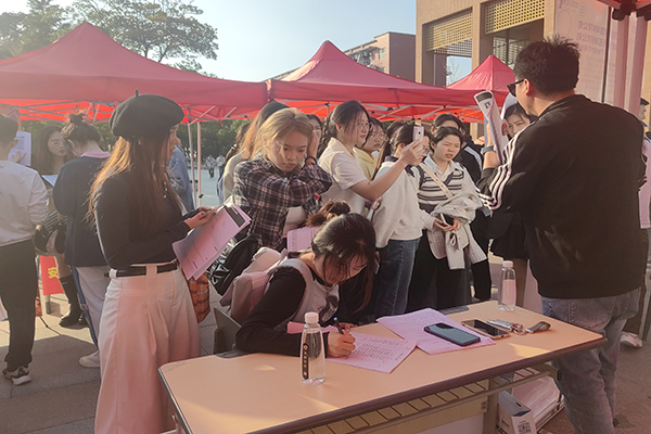 仪式结束后,我院于图书馆南广场为招聘企业和2024届毕业生搭建双选平台,组织了一场大型校园双选会及知名企业专场招聘会。双选会上,招聘企业和毕业生们进行了深入的交流。许多招聘人员表示,他们对我院的毕业生较满意,认为他们具有较扎实的专业知识和良好的综合素质。2020级会计专业的马紫瑄同学参加完招聘会后表示:学院搭建的双选平台涉及专业对口的岗位很多,让大家更好地了解了就业市场和各种职业机会,期望自己能找到合适的工作。招聘会现场,人头攒动,毕业生积极与招聘人员交流,主动了解用人单位情况,现场气氛热烈。
