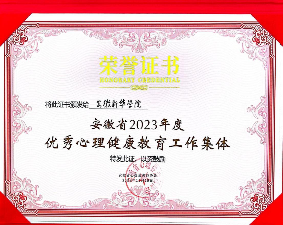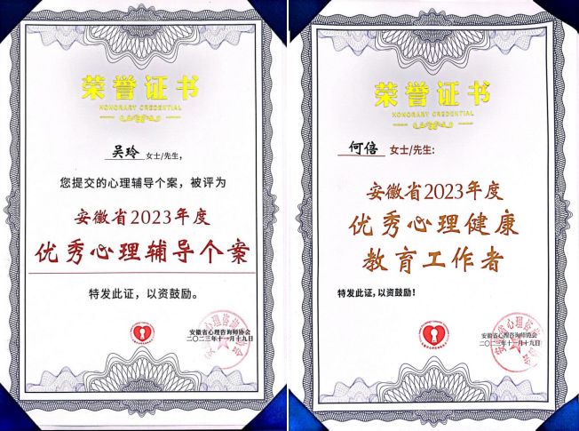 永利官网学生处学生心理健康教育中心获评“安徽省2023年度优秀心理健康教育工作集体”,何倍老师入选“第三届理事会理事”并获评“2023年度优秀心理健康教育工作者”,吴玲老师提交的心理辅导个案被评为“安徽省2023年度优秀心理辅导个案”。