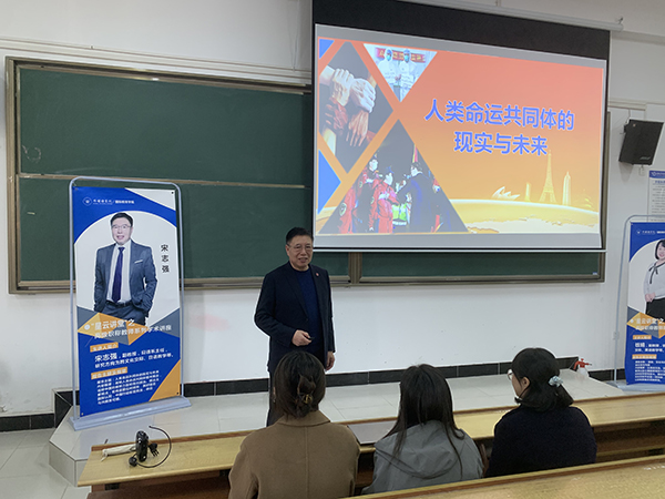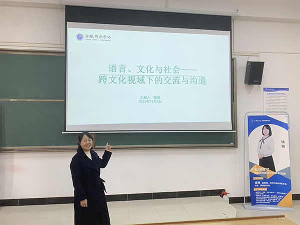 宋志强副教授依托其主持的“人类命运共同体”系列横向课题,以“人类命运共同体的现实与未来”为主题,多维度阐明了人类命运共同体相关概念,以中国行动诠释了中国的榜样力量和责任担当。他向大家展示了中国美好理念的国际认同,认为命运与共前景可期,强调通过合作、理解与尊重实现人类命运共同体的前景。钱娟副教授带来了主题为“语言、文化与社会——跨文化视域下的交流与沟通”的学术报告。主要从语言交流、文化差异、价值观差异以及心理因素等四个方面阐述跨文化交际的背景和意义,强调跨文化交际不仅是一项技能,更是一种心态和思维方式的转变。