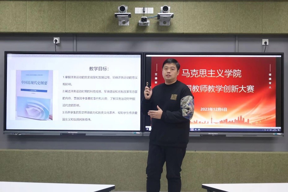 比赛分为说课与教学片段演示两部分进行。参赛教师按照抽签顺序,结合本课程大纲和教学设计思路进行了教学创新汇报,他们以饱满的精神状态、娴熟的专业知识和高度的教学热情进行了课程展示。孙晨忱老师以教学目标为导向,根据教学对象和所教内容特点采取不同的创新教学方法,分享了《习近平新时代中国特色社会主义思想概论》的创新课程设计。李静老师以生动的情境模拟法导入课程,以环环相扣、层层深入的方式展开教学,针对《思想道德与法治》课程展示了自己的创新思路。赵东云老师则以《中国近现代史纲要》中的课程内容为主题分享教学创新方案,通过对多媒体资源的灵活应用,将线上红色文化展馆搬进教室,带领学生们在课堂上体验“行走的思政课”。其他参赛老师也是各显风采,从不同角度进行了精彩的教学展示,充分展现了马克思主义学院教师的业务水平和专业技能。