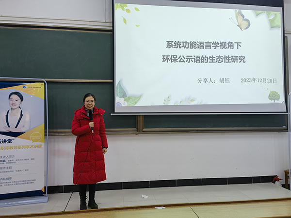 胡钰副教授依托其主持的省级课题:“系统功能语言学视角下环保公示语的生态性研究”,从理论框架、语料收集、分析与讨论、结论与思考四个方面详述了课题的思路来源、研究路径、研究方法以及研究意义。通过课题研究,她向大家展示了合肥市的环保公示语表征了人与自然之间的积极情感联结、同化认知和趋向意动,强调了人类与自然的合一性。