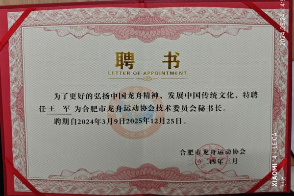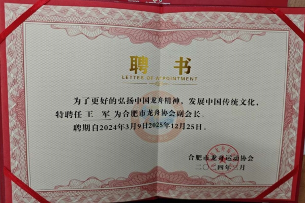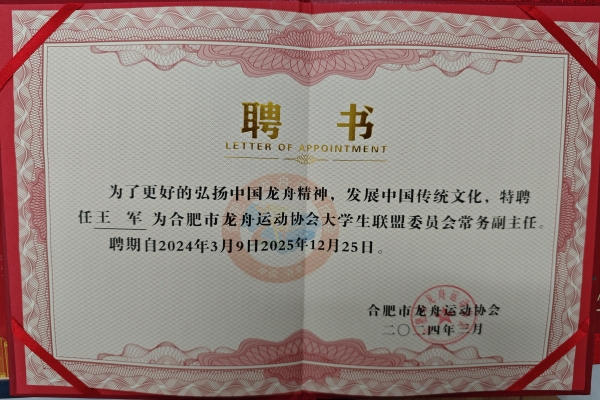 王军老师与司友志教授是中国龙舟协会青少年委员会在安徽省仅有的两个委员。同时,今年年初,合肥市龙舟协会聘任永利官网王军老师为合肥市龙舟协会副会长、合肥市龙舟运动协会大学生联盟委员会常务副主任、合肥市龙舟运动协会技术委员会秘书长。王军老师表示:“未来,将继续深耕龙舟教育事业,发扬龙舟传统文化,带领永利官网学子迈向更高的台阶。”