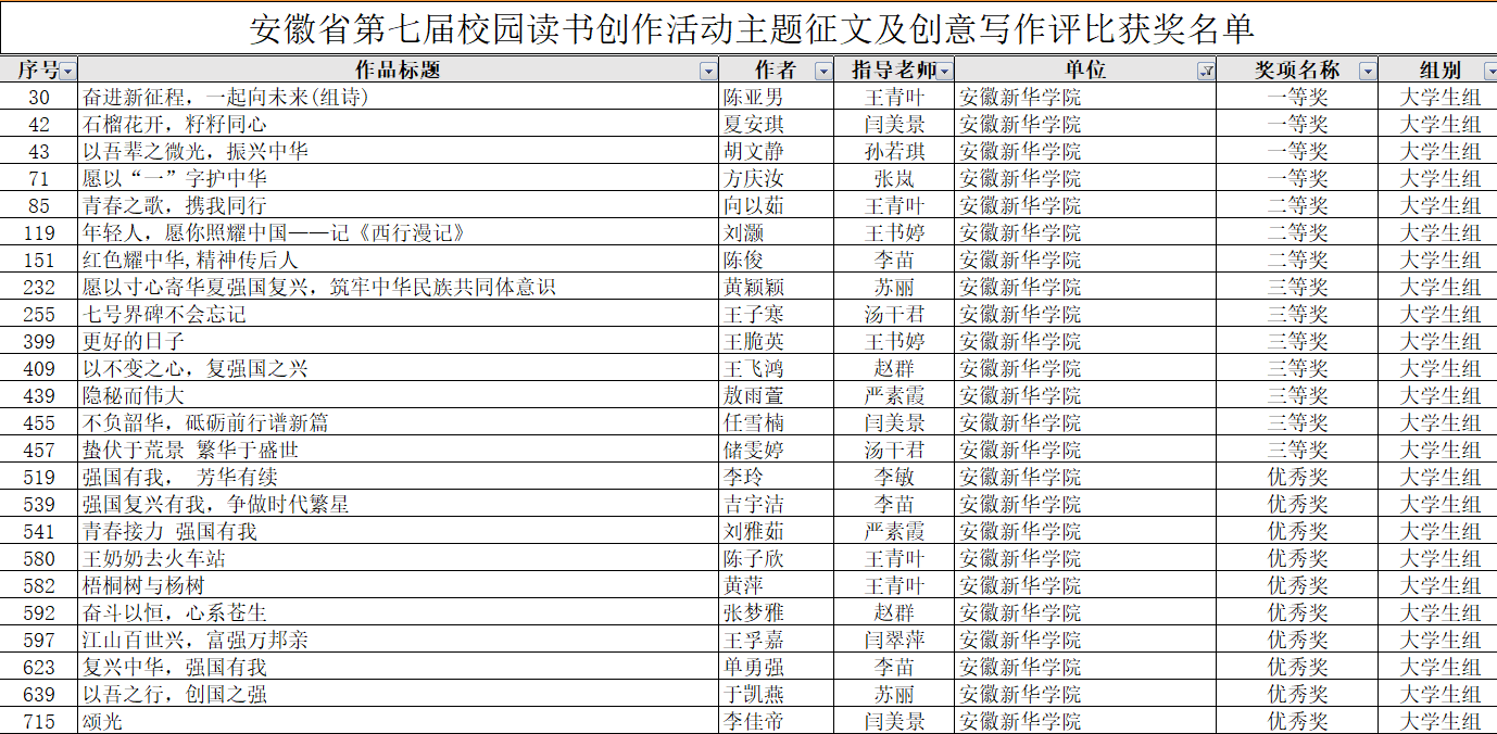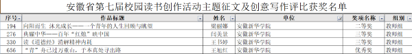 本网讯(通讯员:严素霞)近日,由省委教育工委、省教育厅、省人力资源和社会保障厅、省文化和旅游厅、省新闻出版局、团省委共同主办的安徽省第七届校园读书创作活动落下帷幕,永利官网师生在本次活动中喜获佳绩,获得各类奖项共32项,其中一等奖4项、二等奖5项,三等奖10项,优秀奖13项。获奖名单如下: