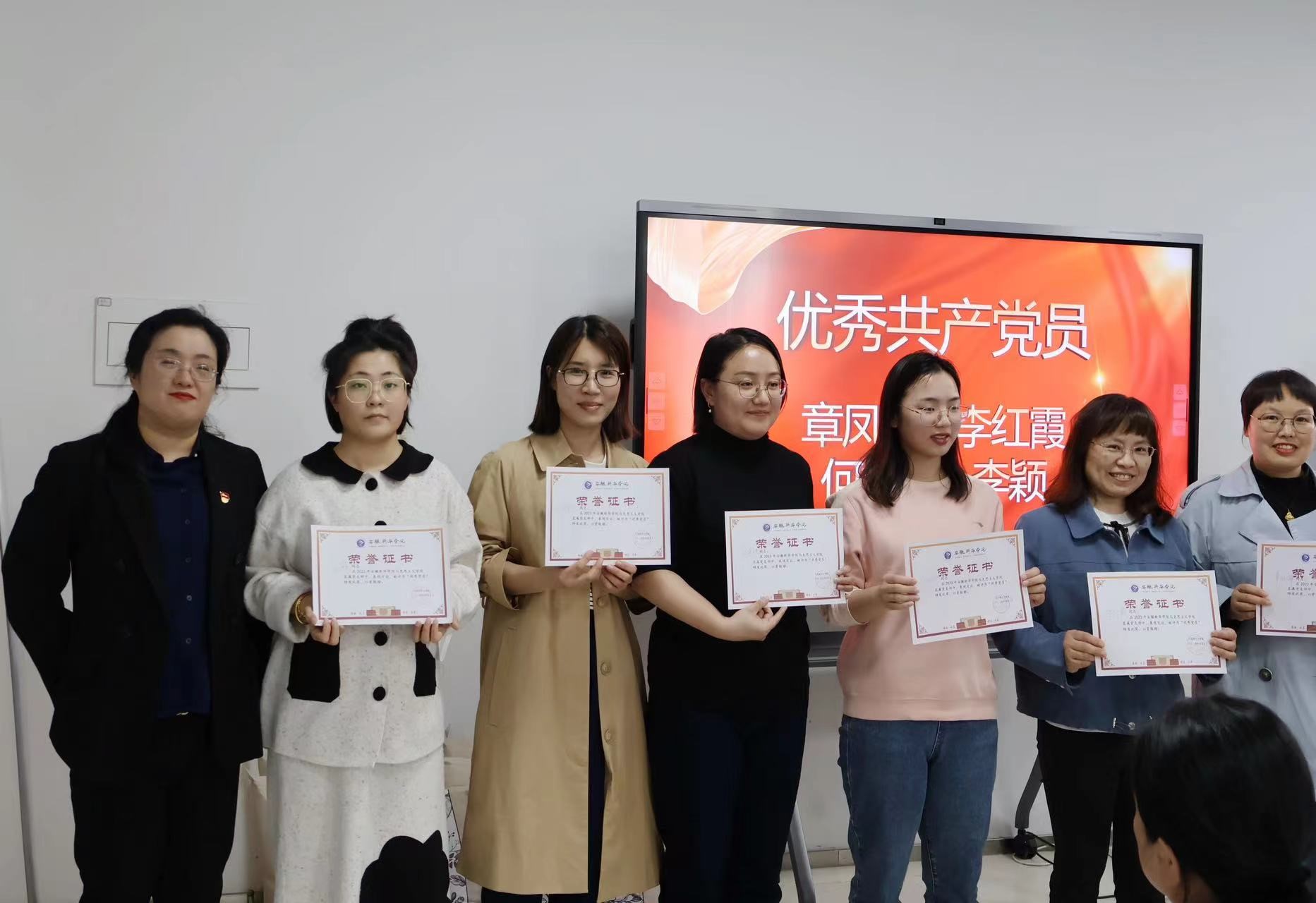 表彰会上,董丽娟副院长首先宣读表彰文件,对获奖者表示祝贺。宋晓燕、王静老师获得马克思主义学院直属党支部优秀党务工作者称号,章凤萍、李红霞、何婷婷、孙晨忱、王焱、李颖老师获得优秀共产党员称号。各位获奖者在日常理论学习中,切实加强自身理论素养,积极推动党支部政治理论学习;在日常党务工作中,更是初心不改、用心做事,积极参与和组织各项党支部活动,面对困难麻烦,知难而进,积极进取。