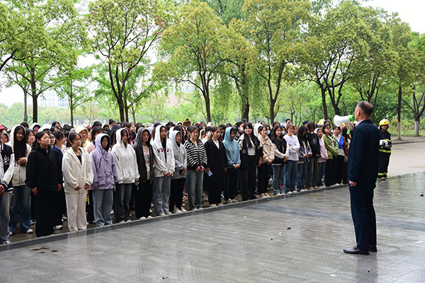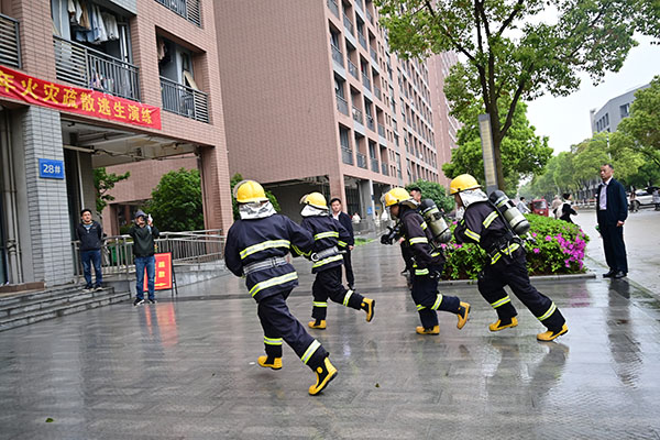 学校微型消防站接到火情指令,消防员迅速穿戴消防装备第一时间赶到现场,使用楼宇消火栓迅速展开扑救初起火灾。完成了整个火灾应急处置流程。演练结束后,保卫处副处长仇陶对整个演练活动进行了讲评。