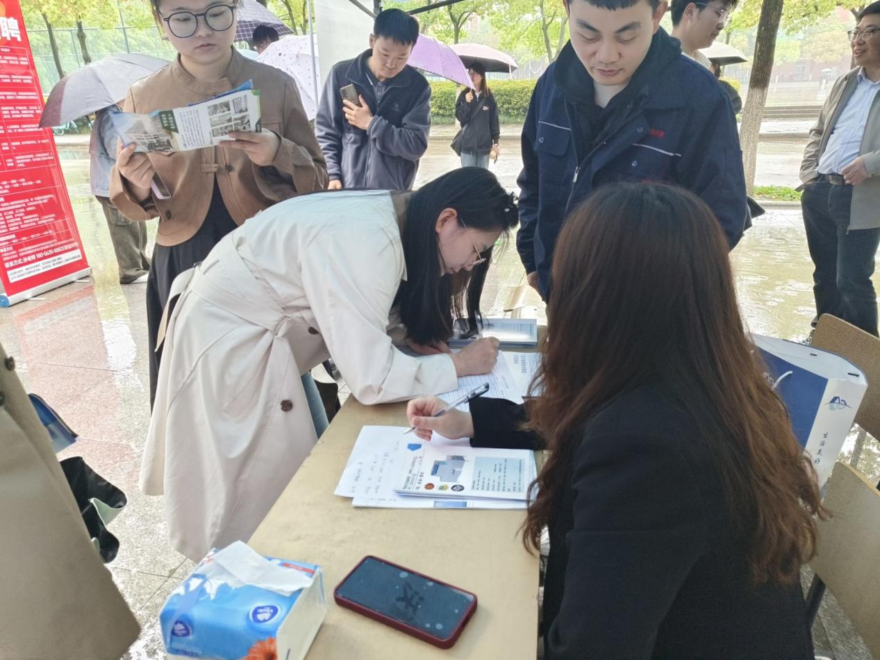 招聘会现场细雨蒙蒙,仍然抵挡不住毕业生的求职热情。毕业生与意向企业负责人积极沟通交流,就具体岗位要求、上升渠道、薪资待遇等进行详细地了解。
