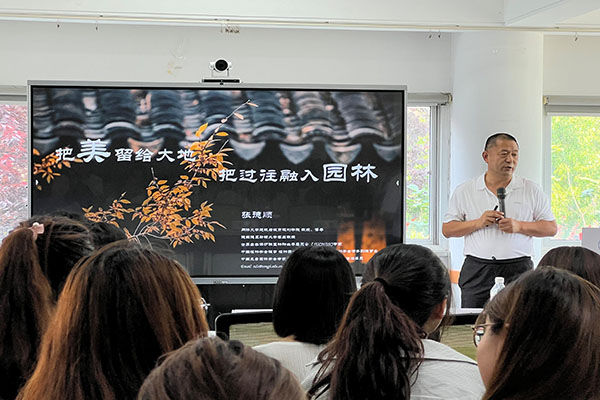 张德顺教授以“把美留给大地,把过往融入园林”为主题,讲述了从“学习中工作,工作中创新”的切身体会,带给学生学习的自信和工作发展的渠道和方法;Mohamed以“Green Urban Solutions: Exploring the Well-being Benefits of Gardens, Trees, and Indoor Plants”为主题,从埃及城市、文字的起源,介绍到现代城市公园、绿色墙面、行道树、屋顶绿化等现代城市园林用地,以人体感知的角度讲述风景园林带给公众的福祉促进,带来了国际视野;云嘉燕以“晚明清初淑媛倪仁吉造园研究”为题,深入分析了女性造园师对中国古典园林发展的影响,云老师研究补充了古典园林中女性造园置景的部分空白点,分享内容出发点的聚焦性和新意性深受学生喜爱;郭丽的分享从“公园城市,美好人居—风景园林定量化研究与设计实践”为题出发,从西蜀园林的数字化修复设计方法分析到现代世界园艺博览会造园实践为学生提供了深入的学习和理解,“仰望星空、共筑风景”也是郭丽对永利官网风景园林学子的希冀和鼓励。
