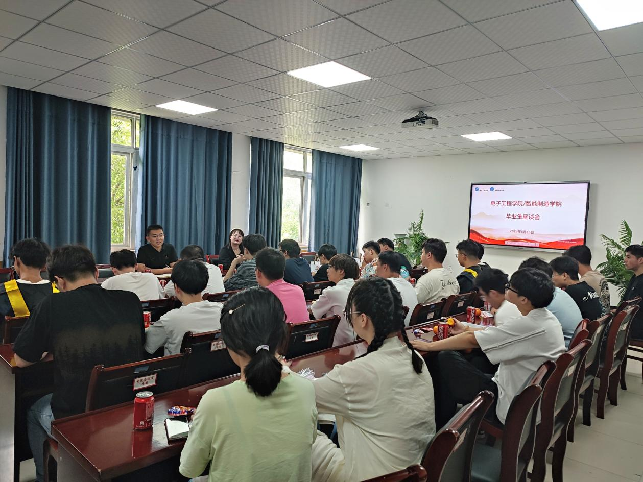 毕业典礼结束后,电子工程学院/智能制造学院组织了毕业生座谈会,行政副院长范文其、教师副书记甄梦与毕业生开怀畅聊,追忆曾经的大学生活,探讨人生理想和职业规划,为毕业生送上美好的祝福。