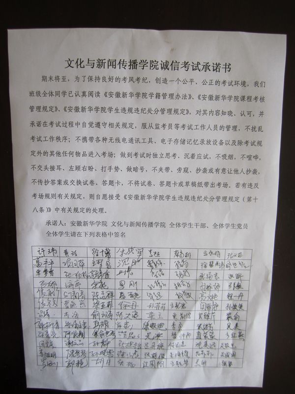 会上,全体学生宣誓承诺,严格遵守考风考纪,绝不作弊,认真复习,同时,每名学生亲自签署了文化与新闻传播学院诚信考试承诺书。文化与新闻传播学院副院长贺行佳指出,文化与新闻传播学院有优良的考试作风,同学们要继续保持下去;各班级召开主题班会,承诺将覆盖到全院每一位同学,承诺是形式,要服务于实施,根本在践行;同学们会后要收集全国优秀共产党员资料,创造良好的学习优秀典范的氛围,将学习落实到现实生活,积极向党组织靠拢。