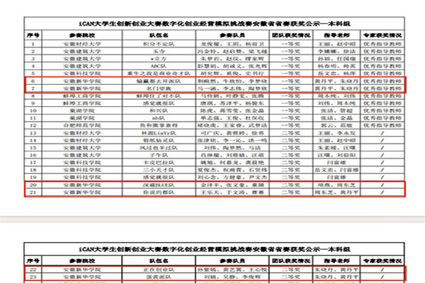 本网讯(通讯员:黄丹平)6月16日,由iCAN大学生创新创业大赛组委会主办,安徽建筑大学、巢湖学院、yl7703永利官网承办的iCAN大学生创新创业大赛数字化创业经营模拟挑战赛安徽省省赛于线上举行。来自安徽大学、合肥工业大学、安徽建筑大学、安徽财经大学、合肥大学、安徽工业大学等共20所省内高校的119支代表队参加。由永利官网财会与金融学院经校赛遴选出的6支队伍荣获省级一等奖2项、二等奖4项,指导老师朱晓丹、黄丹平老师获评优秀指导教师,yl7703永利官网获优秀组织单位。