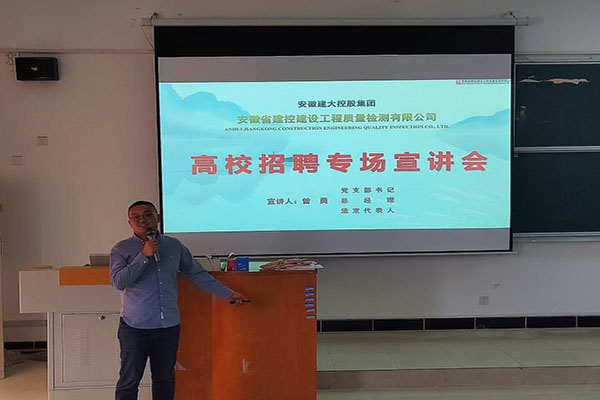 在宣讲会之前,崔风波为安徽建大控股集团总经理曾勇颁发了企业导师聘书。随后曾勇向同学们介绍了安徽省建控检测的服务领域和发展情况,包括建筑工程、市政工程、房地产开发等多个方面,并在省建筑行业内建立了良好的口碑。曾勇回顾了集团的发展历程,他鼓励同学们,无论是面对学业还是职业的挑战,都要有坚持到底的决心和勇气。