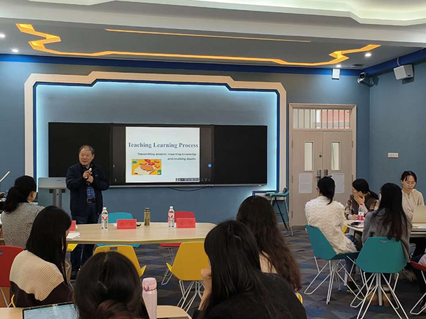 郝亮在开场致辞中强调了在快速变化的教育环境中名师引领对于青年教师成长的重要性,并对曹军教授的莅临表示了热烈欢迎和衷心感谢。接下来,曹军教授的分享以“师者,传道受业解惑”的理念展开,深刻剖析了外语教师的职业定位和应具备的优良品质。随后,曹军教授就交际教学法、任务型教学法、以内容为依托教学等教学方法进行有益探讨,并就教学过程中的教学目标设定、教学活动组织、教学评价实施等给出具体案例分析,帮助青年教师进一步夯实理论基础,为站好讲台提供切实有效的指导。最后,他强调,在AI技术日新月异的今天,外语教师应紧跟时代步伐,积极探索教育教学的新模式、新方法,努力培养学生的创新思维和实践能力,为社会输送更多具有竞争力的创新型人才。