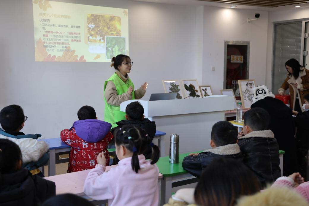 随后,汪舟同学通过现场互动的方式为小朋友们讲解植物叶片变色的奥秘,讲解叶绿素、类胡萝卜素、花青素等色素在叶片颜色变化中的神奇作用,以及温度、光照等环境因素如何影响叶片的颜色;紧接着,展示了精美的植物手作,并引导小朋友们进行自主创作。志愿者们精心准备了各种颜色和形状的落叶,以及胶水、剪刀、画纸等手工材料。