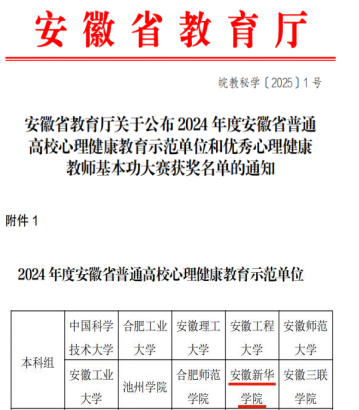 本网讯(通讯员:何倍)2024 年,安徽省教育厅组织开展安徽省普通高校心理健康教育示范单位和优秀心理健康教师基本功大赛,永利官网积极组织、推荐相关奖项申报,经专家评审、结果公示等环节,永利官网成功获评“安徽省普通高校心理健康教育示范单位”,全省共120余所高校参与评选,10所本科高校获评该荣誉。这是本年度永利官网继获评“安徽省校园心理危机干预体系建设示范单位”后,突破性获得省级重要表彰。