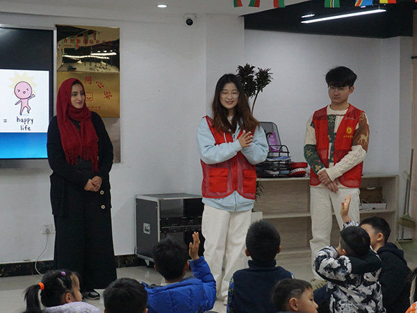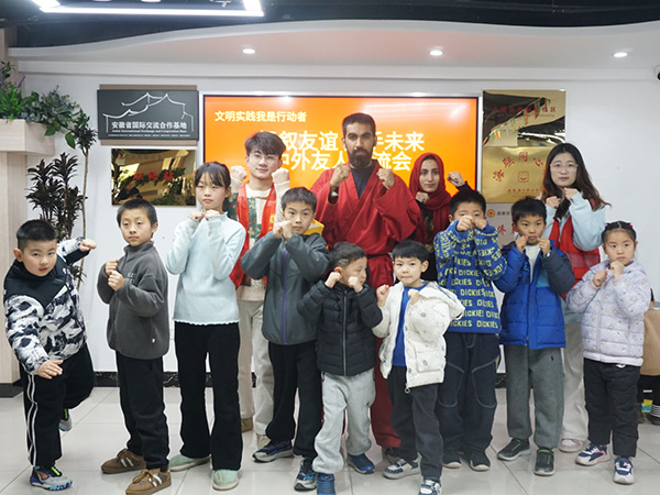活动当天,志愿者们早早地来到了林溪社区“海外人员服务站”,他们身着统一的志愿者服装,面带微笑,热情地迎接每一位前来参加课堂学习的人员。服务站内,巴基斯坦外籍人员以“关注身心健康,快乐成长”为主题,教授社区小学生们学习巴基斯坦传统武术。来自外国语学院学生第一支部的学生鲍远亮、施文艳两人积极配合外籍人士授课,凭借扎实的语言功底和热情的服务态度,迅速融入课堂,他们一对一或一对多地与孩子们进行互动交流,耐心细致地解答学员们在语言学习中的疑惑,帮助他们更好地理解和掌握武术技巧,让孩子们在轻松愉快的氛围中感受到了异国文化的魅力。