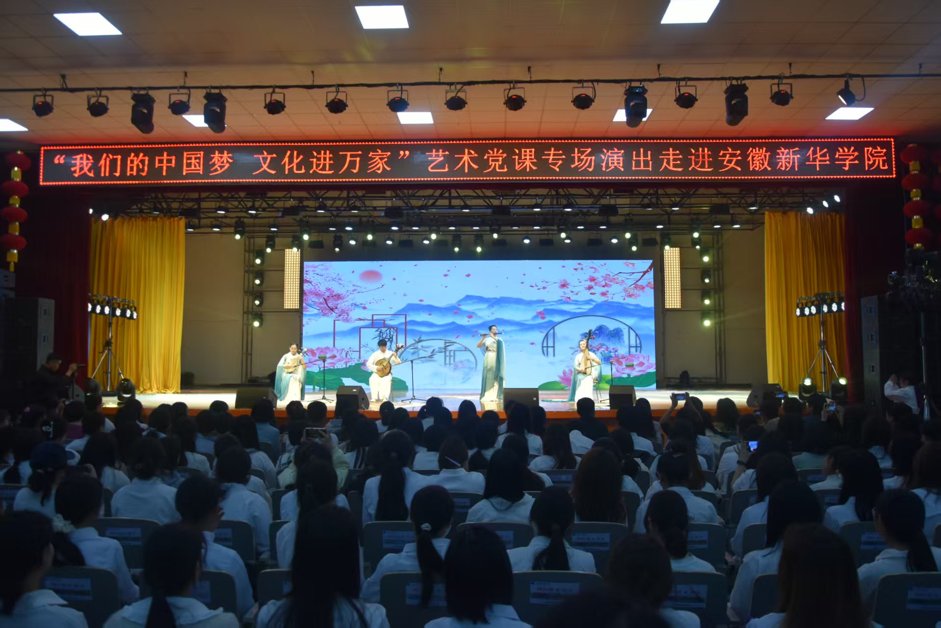 本网讯(通讯员:阳俊琍、濮德馨、张婉琦)为深入学习贯彻党的二十大精神,探索“艺术+”党建新模式,3月27日,由中共合肥市委宣传部指导、永利官网文化与传媒学院联合合肥演艺集团有限公司共同承办的“我们的中国梦 文化进万家”艺术党课专场演出在大礼堂圆满举办。演出以艺术为纽带,集合相声、音乐、舞蹈等多元艺术形式,将党史教育与艺术表演深度融合,为全校师生带来了一场别开生面的“沉浸式党课”,让红色基因在校园中生根发芽。