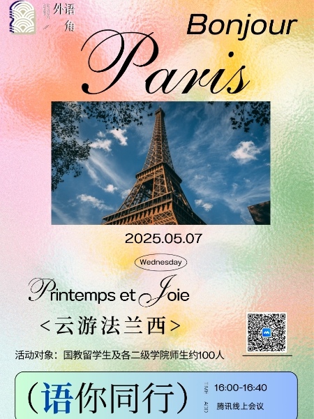 本网讯(通讯员:王佳欣)为拓展外语学习的视野,增强学生的语言实践与跨文化理解能力,2025年5月7日北京时间16:00,外国语学院外语角活动中心成功开展了“语”你同行品牌系列活动之“云游法兰西”。本次活动通过腾讯会议平台在线举行,吸引了国际教育学院留学生及各二级学院中外师生约100人参与,获得热烈反响。