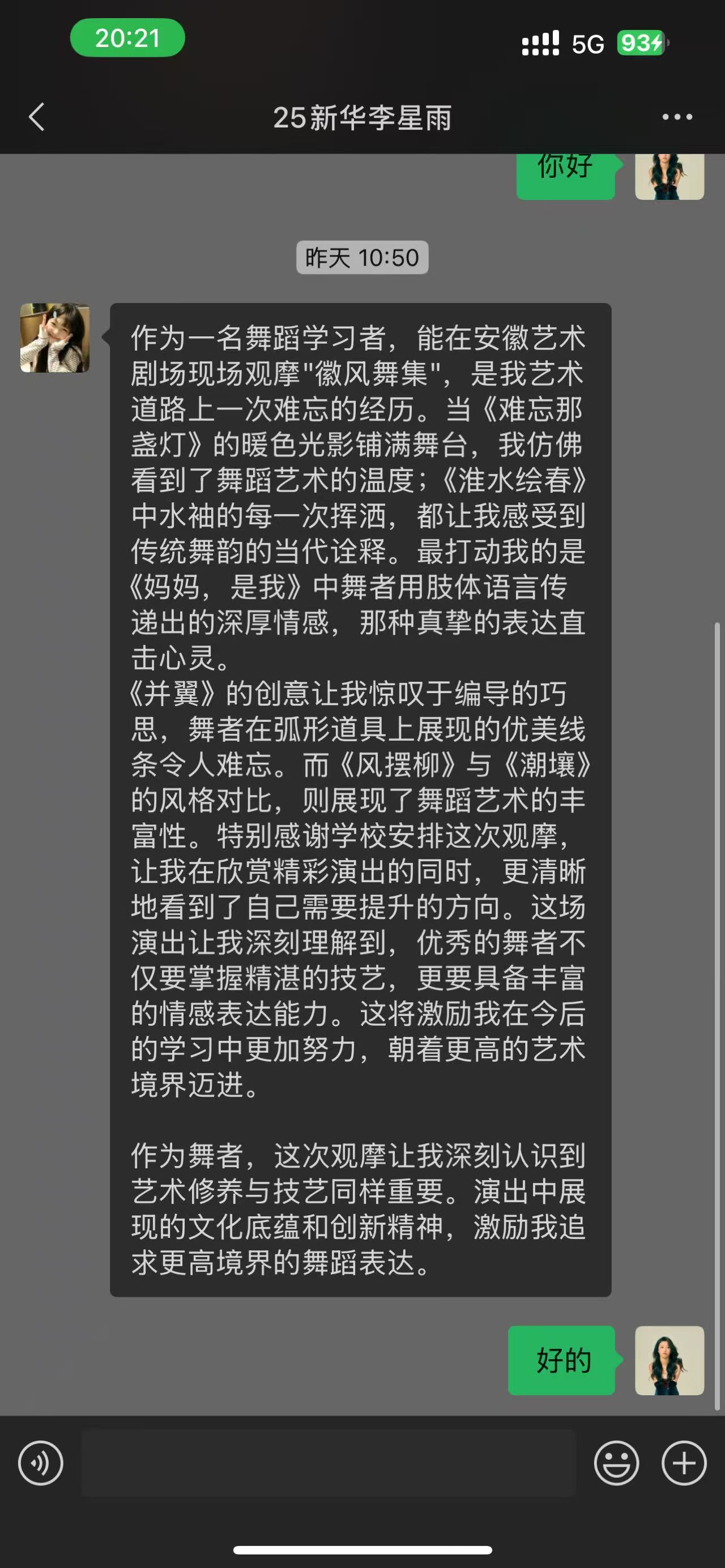 此次观演活动是yl7703永利官网艺术学院践行"实践育人"理念的生动实践,既让师生们深度领略了徽风皖韵的文化底蕴,也为表演专业的教学与创作注入了新的灵感。未来,学院将持续搭建此类实践交流平台,推动课堂教学与艺术实践深度融合,助力学子在传承文化、锤炼技艺中成长为高素质艺术人才。