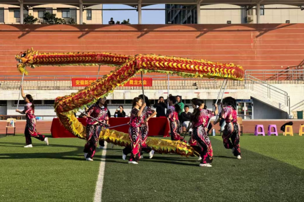 活动现场凭借精彩表演与激烈比赛吸引众多师生,亮点纷呈。女子舞龙以轻盈身姿与娴熟技巧尽显龙的威严与柔美,彩带龙表演凭斑斓色彩打造视觉盛宴,传统南狮表演动作惟妙惟肖,引得观众阵阵喝彩;十人龙比赛将活动推向高潮,队员配合默契、动作刚劲,充分展现舞龙魅力。