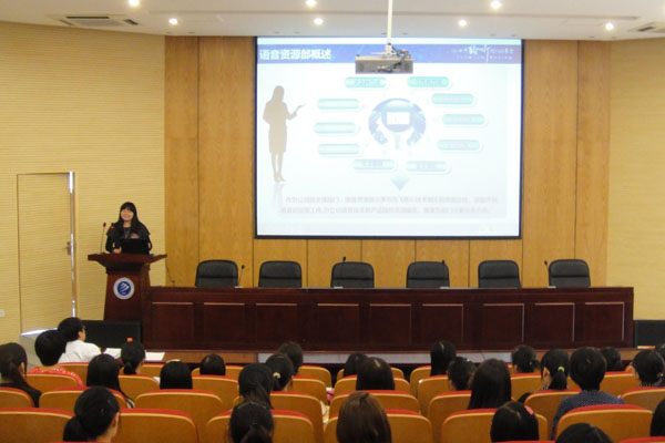 会上,该公司语音资源部负责人全面介绍了公司的工作环境、工作岗位以及福利待遇;并重点推介了英文翻译和英文测评、语音数据标注、资源整理和标注、普通话评测等岗位。该公司另一招聘负责同志向同学们介绍了在线平台工具的使用程序和方法。随后,针对同学们的提问,招聘方一一做了详细解答,并且现场和同学们进行了良好的互动和交流。