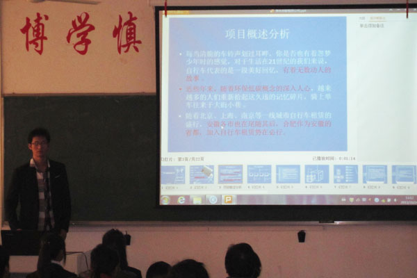 总决赛分创业和就业两组进行。首先创业组7位选手展示了他们创业的周密规划和美好的前景,并现场回答了评委的提问;接着就业组5位选手展示了他们的人生规划。经过激烈角逐,朱长银团队的自行车租赁项目以优异的实战经验和良好的经营业绩,获得本次大赛的创业组金奖,程龙同学以优美的PPT展示了完善的职业生涯规划,也由此获得本次大赛的就业组金奖。本次大赛共设置了一、二、三等奖。大赛历时一个月,首先是辅导员以班会的形式在班级进行全面宣传和动员,通过班级海选,最终每个辅导员选送1组选手,另加第三届职业规划大赛的前三名选手,共有12组选手进入了总决赛。