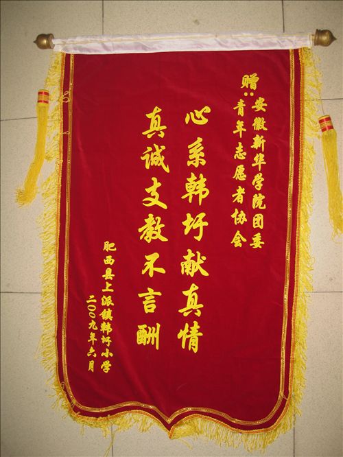日前,肥西县上派镇韩圩小学给校团委青年志愿者协会送来锦旗,上面写着“心细韩圩献真情,真诚支教不言愁”。这是对我院青年志愿者协会刚刚圆满结束的“和谐阳光,快乐成长”为主题的支教之行的表彰和鼓励。永利官网青年志愿者协会一直秉承尽己所能,不计报酬,帮助他人,服务社会,实践志愿精神,传播先进文化,为建设团结互助,平等友爱,共同前进的美好社会贡献力量的志愿精神,践行着志愿事业。