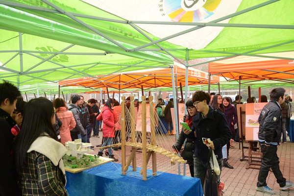 清新小屋是2012级建筑学同学的作品,他们通过SU建模,将自己的课题设计作品按1:100的比例做成实体模型,比例协调,制作规范,展示了土木学子动手能力。