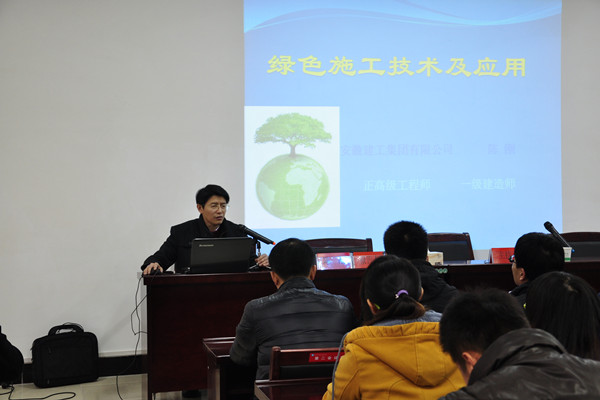 本网讯(唐月)12月20日下午,土木与环境工程学院举办“绿色施工技术及应用”学术报告。本次报告会邀请到安徽建工集团总工办主任、高级工程师陈刚主讲,土木与环境工程学院相关专业师生百余人参加,该院院长方达宪教授主持该场报告会。