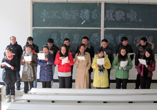 伴随着冬日里温暖的阳光,元月6号中午,原工学院的全体老师在C阶202排练年终晚会大合唱曲目“明天会更好”。