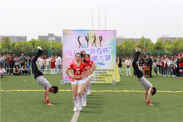 本网讯(刘娟)4月23日中午,永利官网第八届“青春杯”健美操大赛在祥云体育场举行。参加本次比赛的代表队有电子通信工程学院、土木与环境工程学院、信息工程学院、商学院、文化与新闻传播学院、动漫学院、外国语学院、药学院。担任此次比赛的评委有公共课教学部何亚梅老师,校团委洪威老师等。